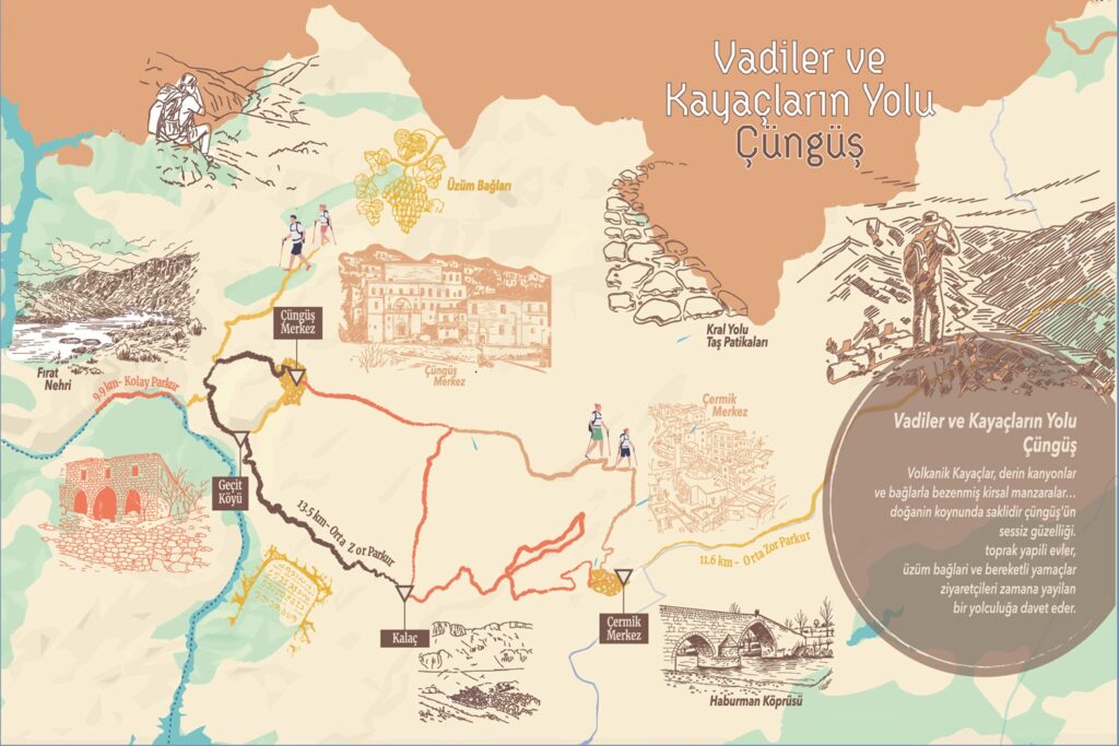 Sabah aracımız ile Çüngüş’e hareket, Akbaşak Köyü’nden Rotaya Giriş, rota tamamlandıktan sonra Fırat nehrinde Tekne turu yapmak için; Feribot iskelesine gidiş-Tekne turu ve Çüngüş’e dönüş.
